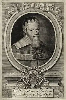 On 10 July 1621 Gibson was appointed a lord of session, and Senator of the College of Justice and took the title of "Lord Durie", his position as clerk of session being then conferred upon his son Alexander, to be held jointly with himself. Sir Robert Douglas, 6th Baronet stated that Gibson was created a baronet of Nova Scotia in 1628, but he does not appear to have used the title.[1]