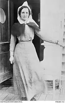 The First World War began in 1914 and in 1915 she joined the Australian Army Nursing Service as a staff nurse. Her mother was then living in Mount Dandenong. She left for Egypt and she worked with the 1st Australian General Hospital during the disastrous Gallipoli campaign where the allies were defeated by the Ottomans. She returned to Australia twice in 1915 on board the SS Euripides as she cared for the severely wounded soldiers who were being returned to their homeland.[1] In the following April she and the 1st Australian General Hospital were sent to France. In April 1917 she was with the 29th Casualty Clearing Station when she became a Sister and in July she was posted to the 3rd Australian Casualty Clearing Station.[1]