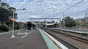Allawah station opened on 25 October 1925 on the same date that the Illawarra line was duplicated.[2] It consists of two island platforms with an overhead concourse and ticket office at the northern end. The original brick station buildings were demolished in the 1990s and replaced by lighter passenger shelters.