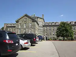 The former Cambridge Almshouse is located in the northwestern corner of Cambridge, on the north side of Matignon Road between Matignon High School and the St. Sava Serbian Orthodox Church. It is a large three-story stone structure with modest Greek Revival styling, set partly across the city line between Cambridge and Somerville. It has a central octagonal administrative section from which four wings of varying sizes radiate. It is built mostly out of slate blocks that were quarried from a ledge on site, with dressed dark granite corner quoining, and granite belt courses between the floors. The rooflines are pierced by rows of gabled dormers.[2]