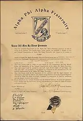 The fraternity's constitution was adopted on December 4, 1906, limiting membership to "Negro male" students and providing that the General Convention of the Fraternity would be created following the establishment of the fourth chapter of Alpha Phi Alpha.[19] The preamble states the purpose of Alpha Phi Alpha: