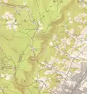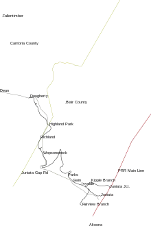 The Altoona and Beech Creek reported itself in the Official Guide of 1903 as having been extended to Fallentimber, 5 miles (8.0 km) beyond Dougherty. However, it does not appear that this extension was, in fact, built.[5] By 1909, the railroad had built two short branches of 1.4 miles (2.3 km) each at the Juniata end of the line. The Kipple Branch left the main line near Broadway and Penn Avenue, Juniata, and circled around to the north, serving a few local industries and reaching the PRR's main line at Juniata Junction, near 2nd Avenue and 10th Street. The Fairview Branch ran southwest from a wye near 25th Avenue and Broadway to end in the Fairview neighborhood of Altoona, at 23rd Avenue and 10th Street.[9]