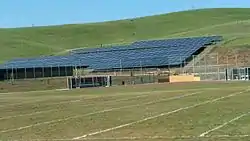 Solar photovoltaic panels are integrated into many of the windows. Installation of a $5 million solar photovoltaic field was delayed because of state budget cutbacks. After its dedication on November 16, 2011,[10] the system began generating 1 megawatt of electricity, and produces between 60% and 80% of the school's energy needs.[11]