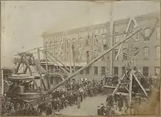 In 1892 American Manufacturing Company became known as American Hoist & Derrick for the next 106 years. The first mobile crane, the Traveling Derrick, was invented in 1895. It consisted of a revolving derrick and steam hoist mounted on a rail-car like wheels. The ditcher, a flatcar-mounted crane designed to excavate soil on either side of a railroad, was invented by Oliver Crosby in 1904.[4] The first crawler was established in 1923 and made cranes mobile. The company became international when the Yokohama Warehouse was constructed in 1905.[5] Major construction projects such as the Panama Canal and Mount Rushmore used cranes from American Hoist & Derrick.[5] American Hoist & Derrick reached 467 on the Fortune 500 list with a total revenue of $464.2 million.[6]