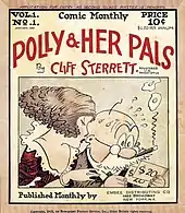 The G. W. Dillingham Company published the first known proto-comic-book magazine in the US, The Yellow Kid in McFadden's Flats, in 1897. A hardcover book, it reprinted material—primarily the October 18, 1896, to January 10, 1897, sequence titled "McFadden's Row of Flats"—from cartoonist Richard F. Outcault's newspaper comic strip Hogan's Alley, starring the Yellow Kid. The 196-page, square-bound, black-and-white publication, which also includes introductory text by E. W. Townsend, measured 5 by 7 inches (130 mm × 180 mm) and sold for 50 cents. The neologism "comic book" appears on the back cover.[12] Despite the publication of a series of related Hearst comics soon afterward,[12] the first monthly proto-comic book, Embee Distributing Company's Comic Monthly, did not appear until 1922. Produced in an 8+1⁄2-by-9-inch (220 mm × 230 mm) format, it reprinted black-and-white newspaper comic strips and lasted a year.[12][13]