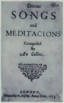 Collins' style has interested scholars and there has been some work done analyzing the metric forms of Divine Songs, such as the usage of Rime royal in The Preface.[5] Collins' collection also has historical significance: it is one of the first collected volumes of women's poetry from the seventeenth century, and it provides a glimpse into the life of a woman writer, as well as insight into the political, social, and religious landscape of seventeenth-century England.[6] Several critics discuss her work in the context of the seventeenth-century tradition of the spiritual autobiography[2][7]