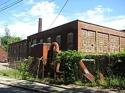 One of the older buildings in the district was the Abbot Mills complex, with history dating to 1814. Located at 18-20 Red Spring Road, it was a 3+1⁄2-story wood-frame barn-like structure. It was next door to the mills of Smith & Dove, which are of stone construction dating to the 1820s. The other major industrial component of the district is the Tyer Rubber complex on Railroad Street, whose main building dates to 1912.[2] The barn-like structure of the Abbot Mills complex suffered a fire in 2013 [3] and was demolished in 2014. Much of the wood in the building was salvaged and recycled.[4]