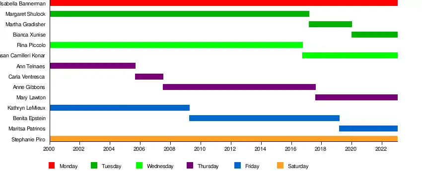 - Friday – Maritsa Patrinos; Benita Epstein (through March 2019);[3] Kathryn LeMieux (through April 2009)