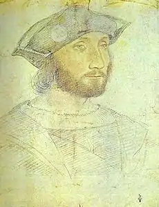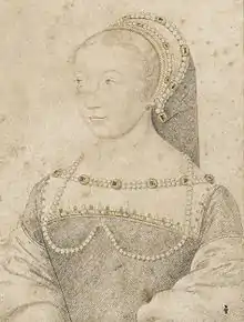 Montmorency married Madeleine de Savoie, a cousin of the king François I on 10 January 1527. Their marriage was sumptuously celebrated by the king during a period of extravagance at court which contrasted with the relative paucity of funds at the disposal of the household of the king's captive children in España.[9] This marriage brought Montmorency into the royal family and going forward the king's mother and sister referred to him as their nephew.[10] Madeleine brought with her to the marriage family lands in Picardie.[6] Her brother, Montmorency's new brother-in-law was Claude de Savoie, comte de Tende the governor of Provence. He was thus afforded a relation with powerful interests near his governate of Languedoc that he lacked in terms of personal feudal control.[11] Together they had the following issue:[12][6][13]