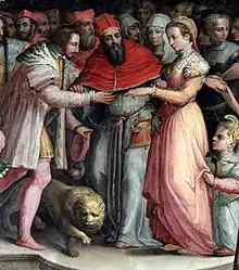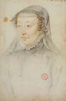 His eldest son, François transgressed against his father's plans for his marriage into the royal family by exchanging legally binding paroles de promesse with Jacqueline de Piennes.[24][25] In reaction to this 'betrayal', Montmorency got a law passed in 1557 that allowed a father to disinherit a son under the age of 30, or a daughter under the age of 25 who married without their parents permission. The law was retroactive, thereby obliging his son to annul the arrangement.[26] He further had Jacqueline confined to a convent. His intended marriage of his son to Diane would go ahead on 4 May 1557, thereby further uniting the Montmorency with the royal family.[27]