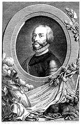 The Holy Roman Emperor Charles V was keen to revenge himself on France for their campaigns in Italia, and to this end appointed the 'traitor' Constable Bourbon to lead an army out from Italia into France in Autumn 1524. Bourbon hoped to invade in coordination with an army under the king of England and the Emperor, however neither would join him in the endeavour. Having invaded Provence, Bourbon became bogged down besieging Marseille while François mustered a strong army at Avignon. On 29 September Bourbon recognised his efforts were hopeless and began a retreat. Montmorency pursued with his cavalry, meanwhile François restored French control over Aix which had fallen to Bourbon.[71] François followed in Montmorency's wake and continued the campaign back into Italia, entering the ducato di Milano (duchy of Milano).[72] Under Montmorency's command were the dauphin and the future royal favourite Saint-André. The dauphin found himself reliant on Montmorency, particularly due to his increasingly difficult relationship with his father François.[73]