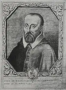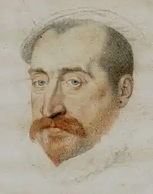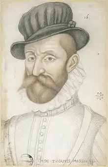 In religious temperament Montmorency, and his wife, were firmly Catholic, and were displeased by the Protestantism Montmorency's sister and nephews adopted.[36] Montmorency's four sons would share his Catholicism, though both Thoré and Méru were sympathetic to Protestantism at one point or another.[32] During his political ascendency, he received concerned reports of the growth of Protestantism in south-west France.[37] Montmorency's Catholicism was not Ultramontane but rather highly Gallican in disposition.[38] It was therefore with Montmorency's encouragement that Henri II flirted with the possibility of schism with the Papacy.[39] He objected to the political program that often existed alongside Protestant movements in France, which advocated radical reforms.[40] Despite this, the realities of Protestant opposition to the power of the Lorraine family in the 1560s meant that Montmorency was drawn in a more tolerant direction by his sons. He would have great affection for his nephews despite his disapproval of their religious persuasion.[41] For Montmorency it was understood that the war on heresy that he supported was not meant to target members of the social elite (such as his nephews). So long as they publicly conformed it was no ones business what they did in their private chapels.[42]