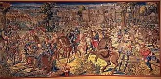 François decided to put Pavia to siege, and settled in for the winter around the city. The Imperial army, conscious that if they tried to wait the French out their army would dissolve for lack of pay, decided to force a battle with the French.[74] The battle of Pavia was an unmitigated disaster for the French. François, Henri II, king of Navarre, the comte de Saint-Pol, the comte de Tende, future father in law of Montmorency and Montmorency himself were all taken prisoner. The Imperial army was almost overwhelmed by the number of prisoners that they took.[75]