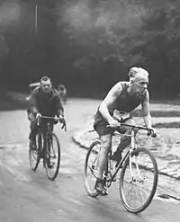 In 1926, Baker, an African American expatriate singer, dancer, and entertainer, caused a sensation at the Folies Bergère. In a new revue, La Folie du Jour, in which she danced the number "Fatou" wearing a costume revealing all but a skirt made of a string of artificial bananas. Wearing only her loincloth of bananas, Baker suggestively performed "danse sauvage" to a Charleston tempo – a genre still new to Europe. Her French producer Jacques-Charles produced her dance numbers with French preconceptions of eroticized savages in mind.[8] Baker performed the piece mostly nude with her partner, Joe Alex.[9] This dance inspired a 1929 tempera painting titled Josephine Baker, first shown by the painter Ivanhoe Gambini in an exhibition of the Radiofuturista Lombardo group he founded.[10]