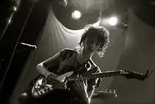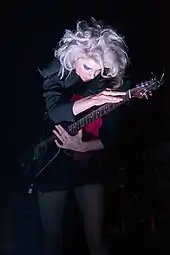 Possessing a mezzo-soprano voice,[98][99][100] Clark's music has been noted for its wide array of instruments and complex arrangements, as well as its polysemous lyrics, which have been described as teetering between "happiness and madness".[30] In response, Clark has said, "I like when things come out of nowhere and blindside you a little bit. I think any person who gets panic attacks or has an anxiety disorder can understand how things can all of a sudden turn very quickly. I think I'm sublimating that into the music."[20] In addition to guitar, Clark also plays bass, piano, organ, and theremin. Her music also often features violins, cellos, flutes, trumpets, clarinets, and other instruments.[101] Her musical style has been characterised as rock,[102][103] pop,[104][105] art rock[106][104] and indie rock,[107][108] incorporating a wide range of influences including experimental rock, chamber pop, electropop, soft rock, and cabaret jazz.[33][109]
