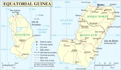 Annobón (Spanish: Provincia de Annobón;[3][4] Portuguese: Ano-Bom) is a province of Equatorial Guinea. The province consists of the island of Annobón and its associated islets in the Gulf of Guinea. Annobón is the smallest province of Equatorial Guinea in both area and population. According to the 2015 census, Annobón had 5,314 inhabitants,[1] a small population increase from the 5,008 registered by the 2001 census. The official language is Spanish but most of the inhabitants speak a creole form of Portuguese. The island's main industries are fishing and forestry.