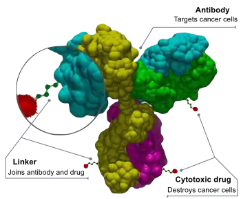 ADCs are complex molecules composed of an antibody linked to a biologically active cytotoxic (anticancer) payload or drug.[3] Antibody–drug conjugates are an example of bioconjugates and immunoconjugates.