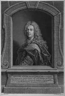 Antoine-Joseph Dezallier d'Argenville (Paris, 1 July 1680 – 29 November 1765), avocat to the Parlement of Paris and secretary to the king, was a connoisseur of gardening who laid out two for himself and his family, before writing La théorie et la pratique du jardinage (published anonymously, 1709; second edition, 1713), based on his experience and his reading.[1] The majority of the illustrations were by Jean-Baptiste Alexandre Le Blond, who was credited as the author in the third edition, 1722.[2] As the work of a gentleman rather than a gardener, as previous French books on gardening had all been, Dezallier d'Argenville's work was laid out like a treatise of architecture, addressed as much to the architect and the patron as to the practising gardener. As its title suggests, the treatise is composed of two parts: the theoretical principles of the art of fine gardening and its practical applications. The first section considers the principles of siting the maison de plaisance relative to its gardens, techniques of laying out geometric figures in parterres, avenues and formal tree plantations (bosquets), and the planning of garden pavilions and the siting of sculpture, an essential element in the jardin français or French formal garden. The second part applies the principles in earth works, terraces and stairs, and the hydraulics necessary for constructing jeux d'eau: fountains, cascades, pools (bassins) and canals.