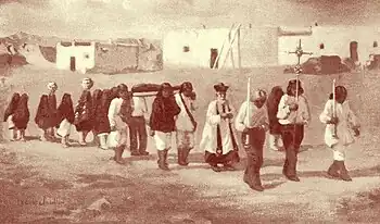 The life of Docher was tied into the legends of Isleta. An earlier missionary, Padre Juan de Padilla, who was buried in the village church, was said to leave his grave and roam the village in the evenings.[5] One day (April 25, 1895), Antonin Docher decided to investigate this ghost's appearance in the presence of other witnesses and opened the grave of Padre Padilla.[31][32] During this event, Anton Docher injured his arm, developing gangrene. Doctors recommended amputation of his lower arm, but the Tiwa evoked the intercession of Padre Padilla. Antonin Docher also prayed to Padre Padilla for a cure, and the wound disappeared.[33][34][35][36][37]