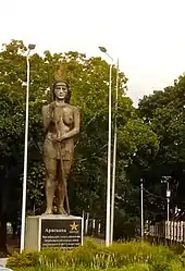 In December 2018, the government of Caracas placed a seven-meter statue of Apacuana on the Valle-Coche highway, the entrance to the capital from the center and west of the country, replacing that of the León de Caracas, a standing lion symbolizing the founding of the city.[31] The plaque on the monument states that Apacuana's "legacy shakes the patriarchal history of the West, fueling the spirit of rebellion in all our generations."[32]