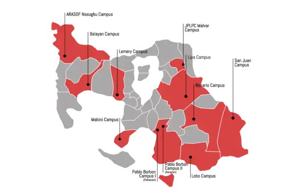 The university's main campuses are located in Batangas City; Governor Pablo Borbon Main I is at Rizal Avenue, Poblacion while Governor Pablo Borbon Main II is within Golden Country Homes Subdivision in Brgy. Alangilan.[10] Both are named in honor of former governor Pablo Borbon. Being the oldest of all the campuses, Main I is the site of the former Batangas Trade School which was established in 1932.[2] Since then, Main I has been the flagship campus and the seat of the administration of the university. The site of the second oldest campus, Main II, was acquired in 1984.[4]