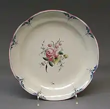 Aprey Faïence is a name used for the painted, tin-glazed faience pottery produced at a glass-works at Aprey, France. This factory was established in 1744 by Jacques Lallemont de Villehaut, the Baron d'Aprey,[1] on his estate. In 1760 he partnered with his brother Joseph, and the two hired Protaix Pidoux, a Swiss pottery painter. Jacques withdrew from business in 1769, so Joseph hired François Ollivier, a potter. Ollivier became director from 1774–1792.[2] The factory came under the ownership of the Baron d'Anthès de Longpierre in 1789,[3] then closed in 1885.[2]