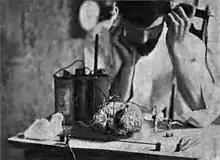 The electromagnetic radiation (radio waves) produced by arc-transmitters was created by an electric arc burning between two electrodes. In Collins' case the electrodes rotated in opposite directions, to provide even wear of their surfaces, thus was called a "revolving oscillating arc".[23] Collins also developed multiple unit water-cooled microphones which could carry heavier currents of 8 to 10 amperes.[24] For a receiver, he used a thermo-electric detector of his own design.
