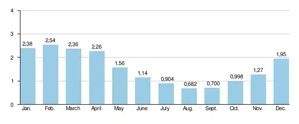 The seasonal fluctuations are small, at least, when compared with the typical French water course. The higher flows occur in the winter to spring period, taking the monthly flow rates to between 1,95 and 2,54 m³ per second, from December to April with a slight peak in February. The low flows occur in late summer and early autumn, from July to October. This gives a low in the mean monthly flow rate of 0,68-0,70 m³ in August and September.