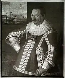 He was ceremonially buried on 2 December 1627 in Gdańsk, in St. Mary's Church. The funeral was financed by the king Sigismund III Vasa. Before his coffin marched 33 pairs of bound Swedish prisoners of war. The coffin was accompanied by a marine guard of honour, royal officials, and members of the City Council.[4] The coffin was laid to rest in the northern wall of the chancel, near the Saint John chapel.[5]