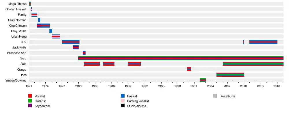 John Kenneth Wetton (12 June 1949 – 31 January 2017) was an English musician, singer and songwriter.[1] Known for his dexterous bass playing and booming baritone voice, Wetton first began to gain fame in 1971 when he joined Family for a short time before joining King Crimson in 1972.[2]