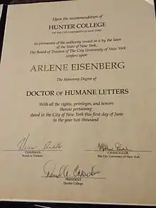- In 2000, Eisenberg, along with her husband was awarded an honorary Doctor of Humane Letters from Hunter College