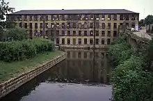 The buildings are principally from Benjamin Gott's 1805 construction, with some 19th century infill and a little of the 1795 corn mill that hadn't been destroyed in the fire in 1804. The mill is l-shaped on sloping ground so varies between four storey and two storey. The main range runs north–south over the millrace and is 23 bays wide, built of ashlar stone with a hipped slate roof. It has a six bay easterly projection (downstream), known as the Corn Mill, built into the sloping ground which is thus two storeys high.[1]