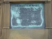 In 1858 Forwood married Lucy, daughter of Simon Crosfield (brother of the businessman Joseph Crosfield), of Liverpool; they had three daughters. Lucy died in 1873, and the following year Forwood married Mary Anne Eliza, daughter of the journalist and historian Thomas Baines, FRS, of Liverpool and of London. They had four sons (the eldest, Dudley, being heir to the baronetcy), and a daughter.[5][6] Forwood died in September 1898 at his home, The Priory, Gateacre, Liverpool and was buried nearby in the graveyard of All Saints Church, Childwall. He had been suffering from colitis, and this led to heart failure. Forwood's estate amounted to a little over £87,320[1] (£10.4 million as of 2024).[7] His statue stands in St John's Gardens, Liverpool.[8]