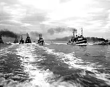 Arthur Foss and tow were spotted by U.S. naval scout planes and escorted into Pearl Harbor on 28 December 1941, where Admiral Claude Bloch cited the crew for action beyond the call of duty. Due to the reduced speed of the voyage, they were a week overdue and had been presumed missing in action. According to Captain Rolstad's log, less than 500 U.S. gallons of fuel remained when they docked (this was the equivalent of running on fumes, as the main engine uses about 42 U.S. gallons per hour).[14][16]