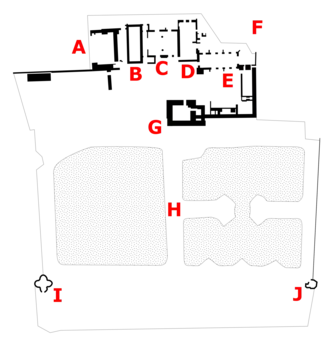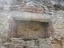 The large chapel, 60 by 21 feet (18.3 by 6.4 m) and built of grey sandstone, lies alongside the Great Chamber, and would originally had an altar on a dais at the north end.[60] One corner of the chapel remains in use as a burial site by the modern Hastings family.[59] An inner, or chapel, court would have been formed by a range of buildings, since lost, stretching between the chapel and the Great Tower.[61] The historian Anthony Emery notes that the castle would have formed a "palace fortress", with the sizeable chapel and adjacent towers constituting symbols of Hastings' power and authority.[62]