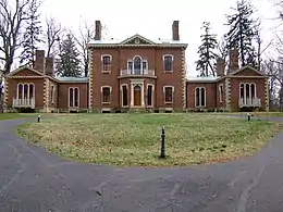Clay divided the Ashland estate among three sons. After his father's death, son James Brown Clay owned and occupied Ashland and a surrounding tract of about 325 acres (132 ha). James Clay had the house razed in 1854, and rebuilding was completed by 1857.[5] Local architect Thomas Lewinski designed the new structure, which used features of the original house: the footprint and foundation, floorplan, and massing, but Lewinski modernized the house stylistically. With many Italianate features, the resulting mansion is a mix of Federal architecture and Italianate details. Inside, James Clay employed Greek Revival features and decorated the home lavishly (see:Victorian decorative arts) with imported furnishings purchased in New York City. James Clay rebuilt the house and his family lived there until his death in 1864.[2] His widow Susan Jacob Clay sold the estate in 1866.
