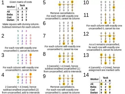 Suppose that a taxi firm has three taxis (the agents) available, and three customers (the tasks) wishing to be picked up as soon as possible. The firm prides itself on speedy pickups, so for each taxi the "cost" of picking up a particular customer will depend on the time taken for the taxi to reach the pickup point. This is a balanced assignment problem. Its solution is whichever combination of taxis and customers results in the least total cost.