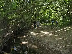 Atascadero Creek springs from the north flank of English Hill, just north of Burnside Road, about 3 miles (5 km) southwest of Sebastopol. It descends to the north, flowing under Barnett Valley Road, Watertrough Road, and Bodega Highway. It continues north through Ragle Ranch Regional Park in the city of Sebastopol,[3] then crosses Mill Station Road, Occidental Road, Graton Road, and Green Valley Road to enter Green Valley Creek about 2 mi (3 km) northwest of Graton.[4] Atascadero Creek is the central channel of the Atascadero Wetland system, designated by the Army Corps of Engineers. It falls under increased protection with the 2015 “new rule” augmenting the 1972 Federal Clean Water Act. As a tributary to Green Valley Creek, Atascadero Creek and wetlands are part of the greater Russian River watershed.