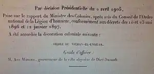 Suddenly, at the end of last July, Yasu left Adis Abeba for Harrar and came on to Jibuti on August 8th, where he renewed his protestations of friendship to M. Simoni, Governor of French Somaliland .... He was found to have deposed Prince Taffari, son of Ras Makonnen, from the Governorship of Harrar and substituted a Muhammadan... Intrigue was rampant at Harrar under the Turk Ydlibi; and finally the chief of the Issas, Ato Marcha, was deposed in favour of a Muhammadan. These events caused a stir at Adis Abeba. The legations of the Entente Powers also sent in a protest. And on September 27th...Lij Yasu was formally deposed.[42]