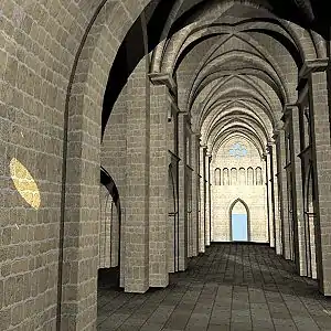 The cloister was located, according to monastic tradition, south of the church. It was partly destroyed at the beginning of the 19th century, but archaeological excavations have revealed details of its layout. As elsewhere, this building consisted of a square courtyard surrounded by four covered galleries, off which opened the various usual rooms: chapter house, refectory, lavatorium and so on.[8]