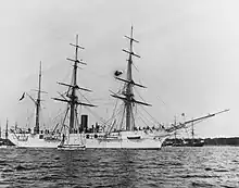 The ships were powered by a single 2-cylinder, horizontal triple-expansion steam engine that drove a screw propeller. The number and type of boilers is not known, but smoke from the boilers was vented through a single funnel located amidships, between the fore- and main mast. The propulsion system was capable of generating 1,000 indicated horsepower (750 kW), for a top speed of 11 knots (20 km/h; 13 mph). On her initial sea trials, Aurora reached a top speed of 11.2 knots (20.7 km/h; 12.9 mph) from 1,165 ihp (869 kW); trials data for the other two ships has not survived. The ships were fitted with a three-masted barque sailing rig to supplement the steam engine on long voyages.[2][3]