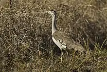 The Australian bustard (Ardeotis australis) is a large ground-dwelling bird that is common in grassland, woodland and open agricultural country across northern Australia and southern New Guinea. It stands at about one metre (3 ft 3 in) high, and its wingspan is around twice that length. The species is nomadic, flying to areas when food becomes plentiful, and capable of travelling long distances. They were once widespread and common to the open plains of Australia, but became rare in regions that were populated by Europeans during the colonisation of Australia. The bustard is omnivorous, mostly consuming the fruit or seed of plants, but also eating invertebrates such as crickets, grasshoppers, smaller mammals, birds and reptiles.