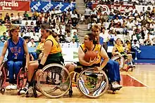 Prior to the start of the 1996 Paralympics, Australia was ranked third in the world after their bronze medal at the 1994 Wheelchair Basketball World Championship, behind first placed Canada and United States.[5][6] In lead up preparations for the games, the team toured Canada.[7] Australia's women's team beat the American team at the Paralympics in pool play. This was viewed as extremely significant by Australian women's wheelchair basketball fans and the Australian Paralympic Federation because the game was invented in America. Also, it was the first time that the Australian women had defeated the Americans. The match had even more significance because Australia needed to win it in order to stay in contention for a medal. Australia was down 21–16 at halftime. Australia went up with seven minutes left in the second half. The match finished with a score of 31–27 in Australia's favour. American Sharon Herbst was their team's start performer and she caused a number of problems for Australia's defence. During the game, several players were knocked out of their wheelchairs, including Australia's Melissa Ferrett.[5] The Americans challenged the win, protesting because they believed the Australians were not wearing matching uniforms.[8] Australia beat Brazil 67–8, beat the USA 31–27 and lost to Germany 34–26 in pool play.[4] They lost to Canada in the semi-finals, going down 31–36. They played the Americans in the bronze medal match, losing 30–41.[5] The team's top scorer in the competition was Liesl Tesch.[5]