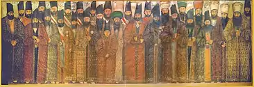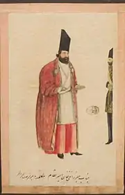 ![]() Aziz Khan Mokri (right) standing beside the young crown prince Mozaffar ad-Din Mirza, who later became King (Shah) in 1896. Painted by Mohammad Hasan Afshar in 1860–1870. Stored in the Louvre | |