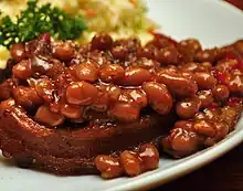 While baked beans was initially a New England region cuisine, the dish has become a popular item throughout the United States; and is now a staple item served most frequently along various types of barbecue and at picnics.[19] This is due in part to the ease of handling, as they can be served hot or cold, directly from the can, making them handy for outdoor eating. The tomato-based sweet sauce also complements many types of barbecue. The already-cooked beans may also be baked in a casserole dish topped with slices of raw bacon, which is baked until the bacon is cooked. Additional seasonings are sometimes used, such as additional brown sugar or mustard to make the sauce more tangy.[7]