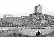 The current tower house resembles Leamaneh Castle in that it was constructed over a prolonged period. The oldest part is the tall eastern tower, likely built in the 15th century. In 1564 the O'Connors lost their territory and in 1584/5 the castle was formally ceded to Sir Turlough O'Brien. Following the 1641 rebellion and subsequent Cromwellian reorganization, Turlough's son Daniel petitioned the English Commission in 1654 to save the house from demolition. Either he or his son, Teigue, eventually built the expansion at Ballinalacken. Teigue's son in turn, Donough, styled himself "of Ballyneleackan". The house remained in the possession of the Ennistymon O'Briens until the middle of the 18th century, when it passed to a different branch of the family. The Ballinalacken O'Briens trace their descent from Turlough Don who died in 1528, and also from the Ennistymon branch of the O'Briens, which was founded by Sir Donald O'Brien of Dough Castle (Lahinch) who died in 1579.[2] In 1641-2 it was held by Daniel O'Brien of Dough and in 1654 a Cromwellian officer ordered the castles of Dough and Ballinalacken to be preserved from the dismantling of fortifications. In the 1667 Act of Settlement a Captain Hamilton became owner, but the O'Briens regained possession. The O'Briens were one of the most powerful families in Ireland at the time and built several castles - of which Ballinalacken is one. In 1837 its owner was planning to repair it.[3][1]: 113–5 [4]: 15