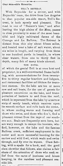 "The ocean frontage of La Ballona Rancho was known in early days as Ballona Slough. It consisted of marshy fields broken by sand dunes and lagoons of salt water, which were considered worthless as home for [anything but] duck and other game birds. In 1870 a native of Switzerland with the historic name of William Tell built a shack on the site of the present Del Rey Hotel, and named it Tell's Lookout. He furnished boats, guns and fishing tackle for his patrons. In 1877 Michael Duffy opened what he called Hunter's Cottage in Tell's old location. He furnished board as well as hunting outfits."[34]