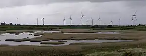 ![]() Ballywater Wind Farm across a salt marsh near Ballinoulart Beach | |
