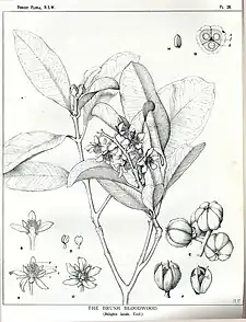 The scrub bloodwood occurs along almost the entire east coast of Australia, from Tilba Tilba in southern New South Wales, to Coen on Cape York Peninsula.[7][4][8] It also occurs on Lord Howe and Norfolk Islands as well as New Caledonia.[7][9] The habitat is tropical, subtropical and warm temperate rainforest. The altitudinal range in north Queensland is 400 to 900 m (1,300 to 3,000 ft).[7]