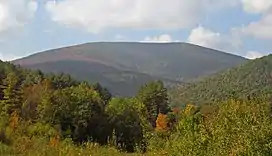 Balsam's slopes are covered with typical forestation for their elevations in the Catskills. Northern hardwoods, primarily beech, birch and maple species, predominate, with some occasional cherry and mountain ash.[9] Southern species such as oaks, isolated American chestnuts that survived the blight, shagbark hickory and dogwoods are located close to streams near the base.[10] The northern hardwood species become more stunted and dwarfed at higher elevations, more so on the ridges. On the mountain's summit, boreal species such as balsam fir and red spruce make an appearance, forming some small stands but not a continuous cover as is seen on higher peaks in the range. Around 1970, Catskill forest historian Michael Kudish found the few remaining trees in a fir stand at 3,150 feet (960 m) on the north slope; these have since all died due to heavy deer browse.[11] A large stand of tall hemlock is located in Mine Hollow[12] around 2,400 feet (730 m).[11]